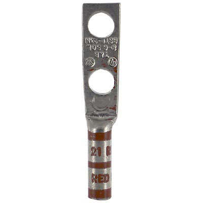 Thomas & BettsCopper Two-Hole Lug, Long Barrel, Blind End, Max 35kV, Wire Size #8 AWG, 1/4 Inch Bolt Size, 5/8 Inch Hole Spacing, Tin Plated, Die Code 21, Die Co...