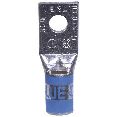 Thomas & BettsCopper One-Hole Lug, Standard Barrel, Peep Hole, Max 35kV, Wire Size #6 AWG, 5/16 Inch Bolt Size, Tin Plated, Die Code, Die Color Code Blue