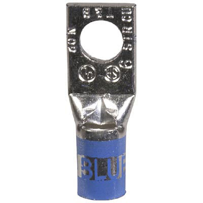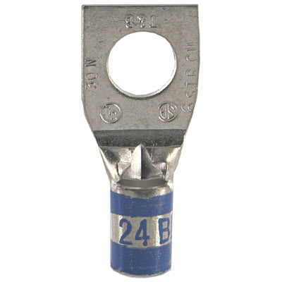 Thomas & BettsCopper One-Hole Lug, Long Barrel, Peep Hole, Max 35kV, Wire Size #6 AWG, 1/4 Inch Bolt Size, Tin Plated, Die Code 24, Die Color Code Blue