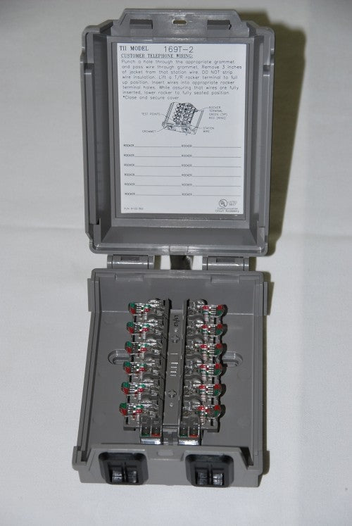 TII Network TechnologiesIndoor/outdoor residential telephone wiring terminal mounted in an enclosure. Wire terminal consists of two independent sealed wire termination blo...