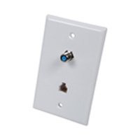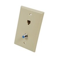 Flush mount duplex wall plate with an F-81 coaxial connector and an RJ11 voice jack.