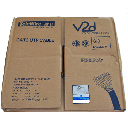 UTP, 6PR Wire, 24AWG, CAT3, indoor/outdoor. Color Black Box of 1000'